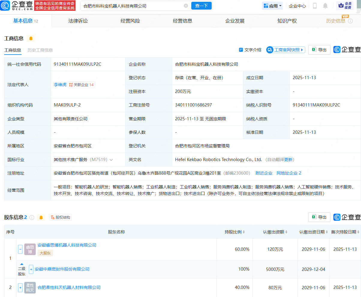 近日网络证劵杠杆平台,合肥市科科宝机器人科技有限公司成立,法定代表人为李维虎,经营范围包含:智能机器人的研发;工业机器人制造;工业机器人销售;服务消费机器人制造等。企查查股权穿透显示,该公司由中鼎股份(000887)全资子公司安徽睿思博机器人科技有限公司、合肥柔性科天机器人材料有限公司共同持股。
