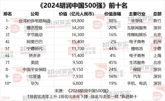 2月25日,2024胡润中国500强出炉。榜单TOP10中,包括台积电、腾讯、字节跳动、阿里巴巴、宁德时代等,其中4家深圳企业上榜TOP10,华为重返前十,友邦保险退出前十。